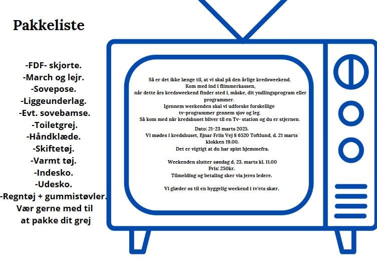 Vi er blevet inviteret med på Kredsweekend af Toftlund FDF som vi bl.a har været på sommerlejr med i 2024. Nogle af børnene har derfor allerede mødt folk fra Toftlund, men man skal bestemt ikke holde sig tilbage, hvis man ikke har. Sara vil være med som leder fra FDF Vejen, så der vil være et velkendt ansigt hele weekenden. I kassen "dokumenter" til højre på denne side kan I se hele indbydelsen.