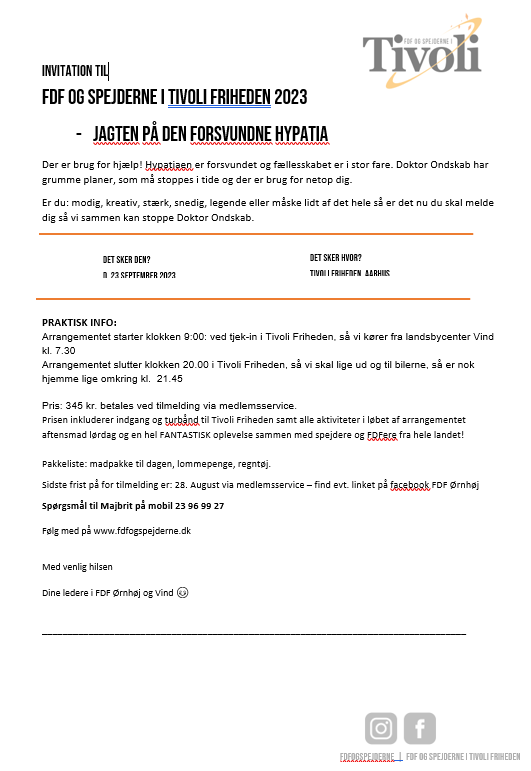 Vi har denne gang brug for at nogle forældre kører og tager med ind i tivoliet. Der er lederkursus omkring landslejren næste år samme weekend og derfor kan alle ledere ikke deltage denne gang.